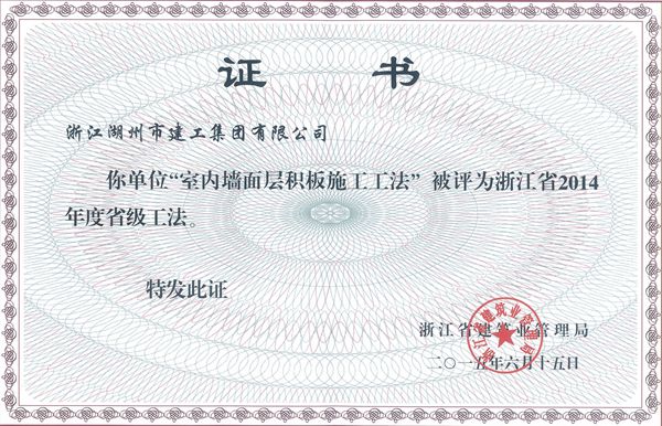浙江省建筑业管理局6月公布的浙江省2014年度省级工法名单中,集团公司陈有生、孟海荣、施华东、郑佳、王汝伟等完成的《室内墙面层积板施工工法》榜上有名。