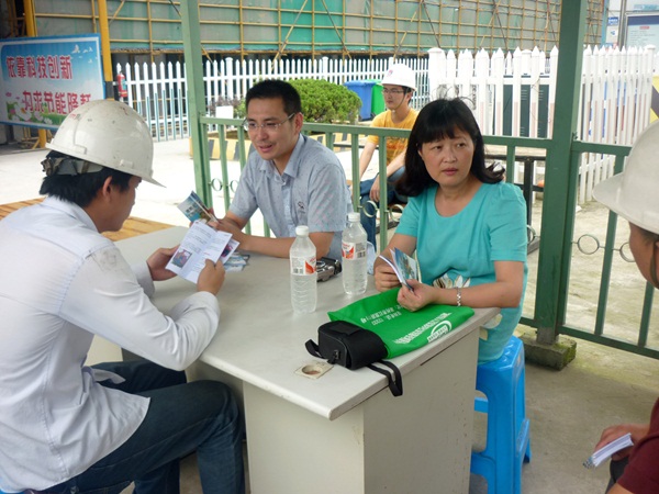 2015年6月30日下午,湖州市人力资源和社会保障部张弦副处长和俞红莲送法到工地,到我公司施工的湖州市市民服务中心进行《工伤保险条列》等法律、法规、政策的宣传、讲解,受到企业和职工的欢迎。